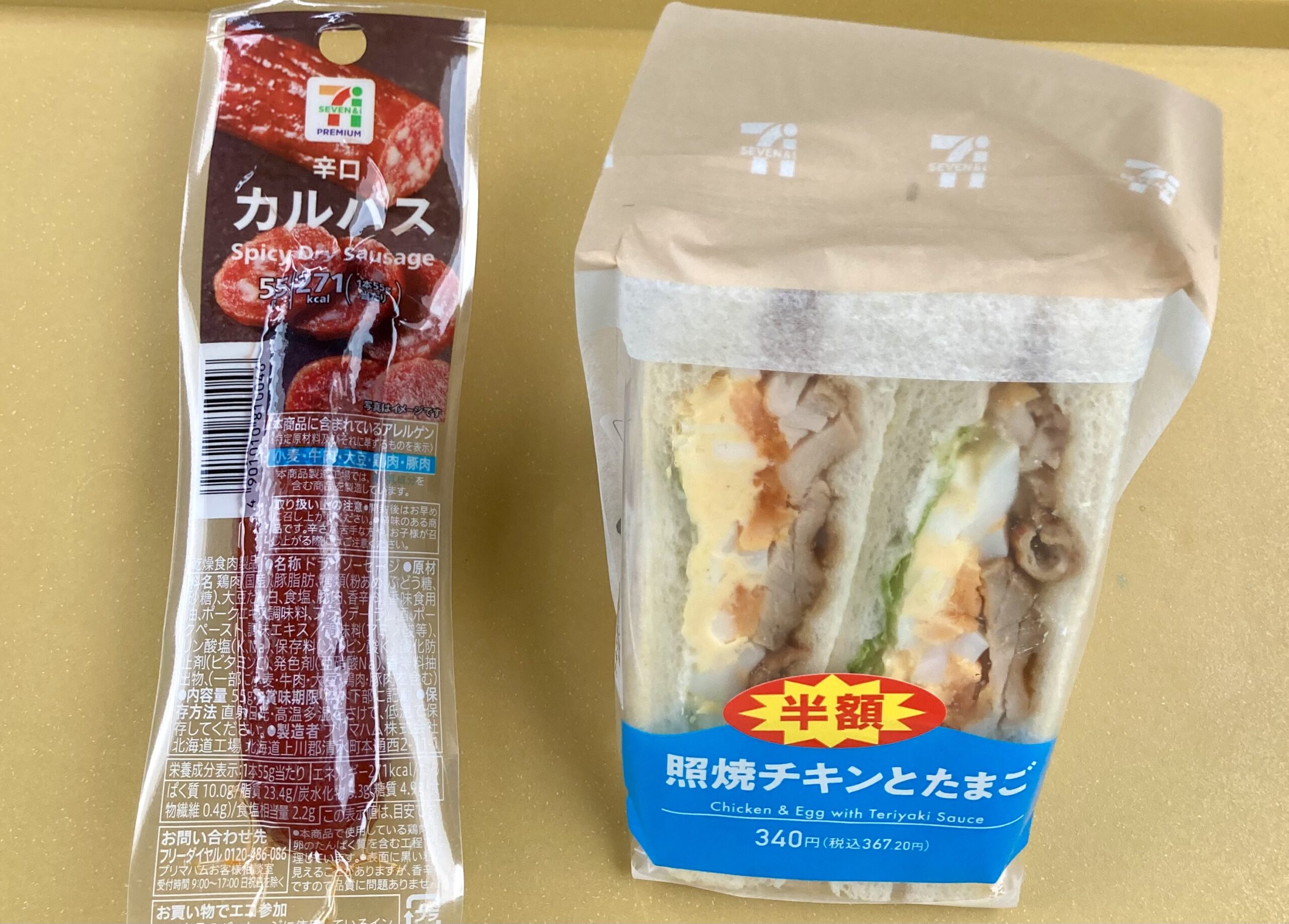 そういえばセブンイレブンにもあった割引サービス。半額は嬉しい。「照焼チキンとたまご」サンドイッチにシールが。税込367円が半額になる。これはすかさずチョイス。