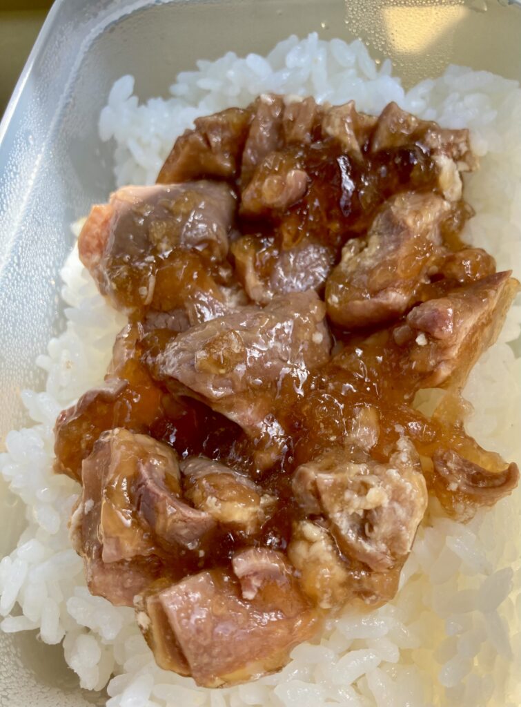 おにぎりじゃなくて良かった。ごはんに乗せられます。缶詰は汁が結構残るから、ごはん乗せは汁まで無駄なく味わえて良い。ああ、でも今回はゼラチン状になってる…。温めたら、汁になるんだろうね。でもこのゼラチンもごはに絡めたら結局、美味しいです。