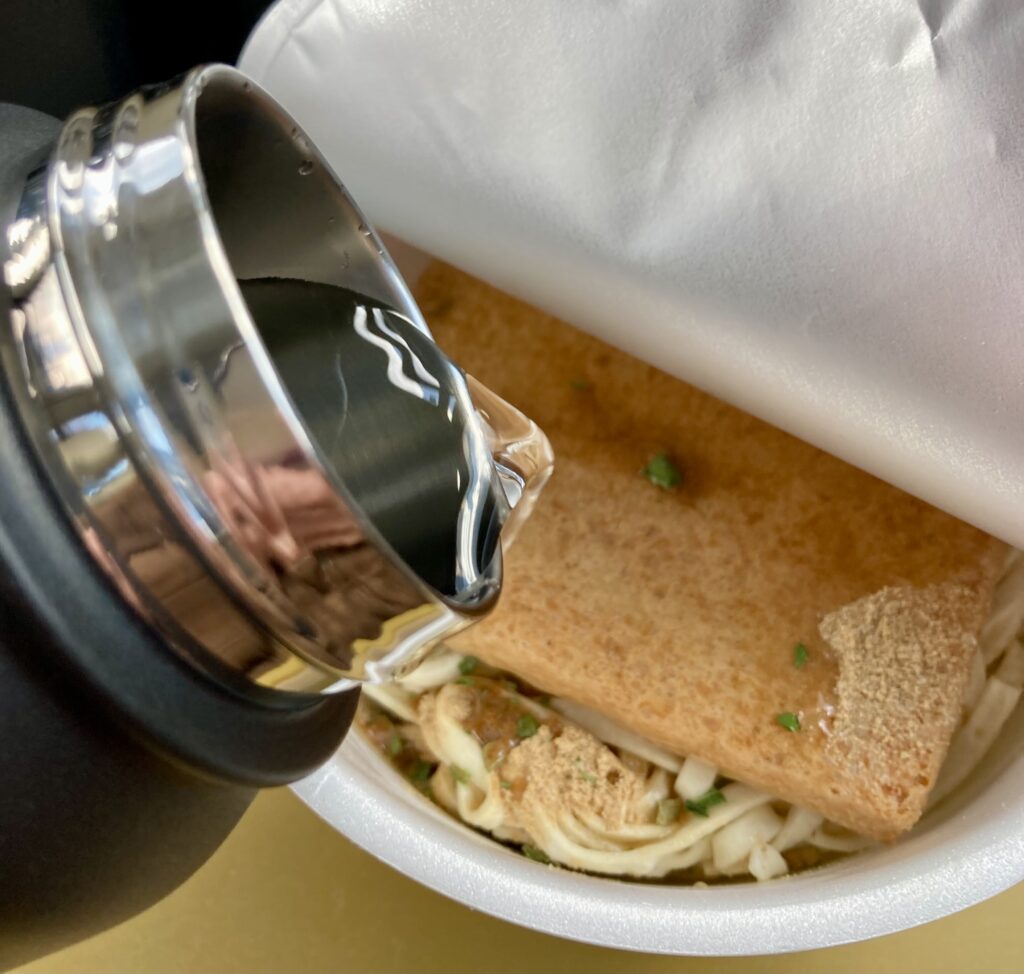 電気ケトルで沸かしたお湯を水筒に入れてから、4時間経過した状態のお湯を注ぎます。湯気はしっかり立っているけど、もちろん沸き立てほどはない。しかし、ゴクゴク飲めるほどぬるくもない、といった温度です。