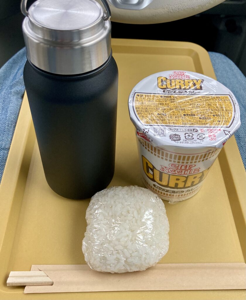 ジャーに1膳分くらい余りそうなごはんが残ってる。おかずは無いけどごはんだけでも明日のサバイバル飯に備えよう!カップ麺に入れるかぁ。という事で、ストックカップ麺と水筒も用意。